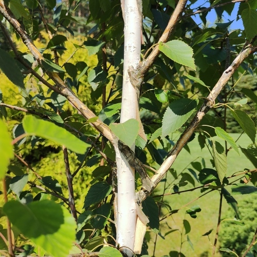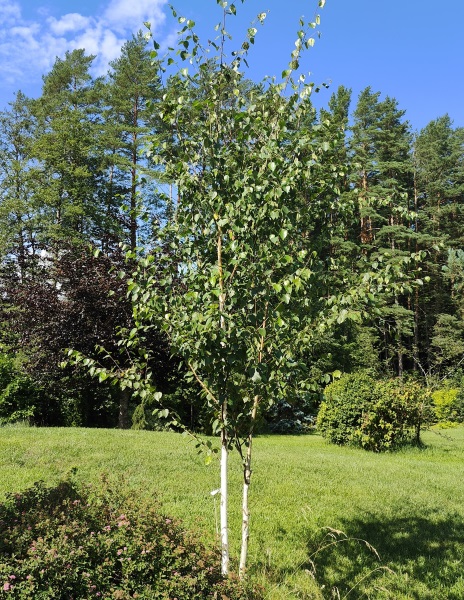 Aprašymas: Vienas populiariausių medžių šiuolaikiniuose soduose. Auga vidutinio ūgio, iki 10 m aukščio. Žievė lygi, ryškiai balta, jau nuo 3-4 augimo metų pabaltuoja. Lapai stambesni už vietinių beržų, rudeniop pagelsta.